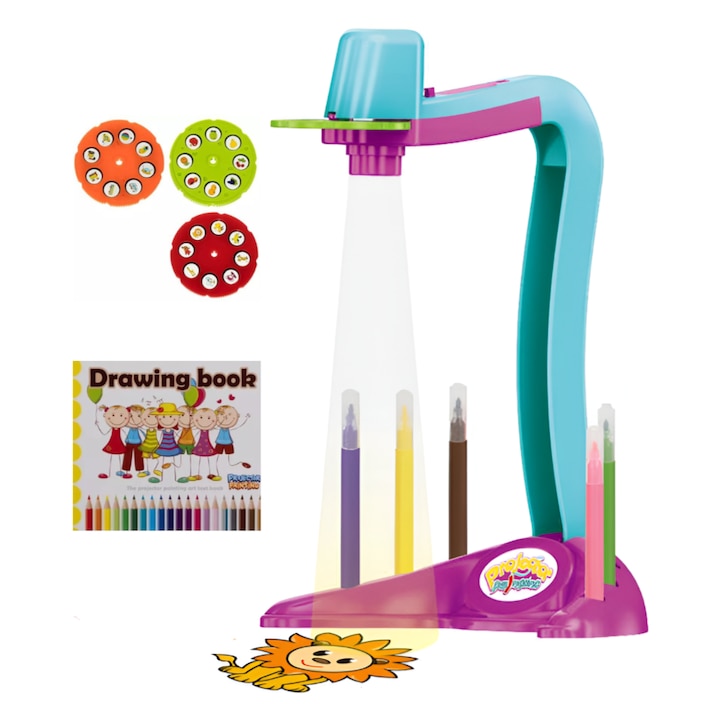 Jucarie Educationala Proiector pentru Desenat Velixo®, cu Hologram, 3 Discuri cu 24 Imagini, 6 Carioci, Caiet Desen, Suport Carioci, Dezvolta Abilitati Manuale, Coordonarea Mana-Ochi, pentru Copii, Fete si Baieti, + 3 ani, Baterii LR44 Incluse, Multicolor