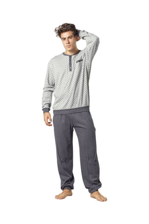 Babelo - Pijama, pentru barbati, de bumbac cu maneci si pantaloni lungi, inchidere cu nasturi la baza gatului, Gri, 48 EU