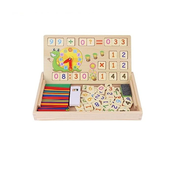 Joc educational, Tabla multifunctionala de scris, invatare matematica, Include Burete, Creta, Cifre, Lemn Natural