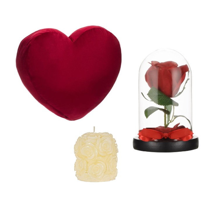 Cadou pentru ziua indragostitilor, Trandafir decorativ in cupola, lumanare parfumata si perna in forma de inima