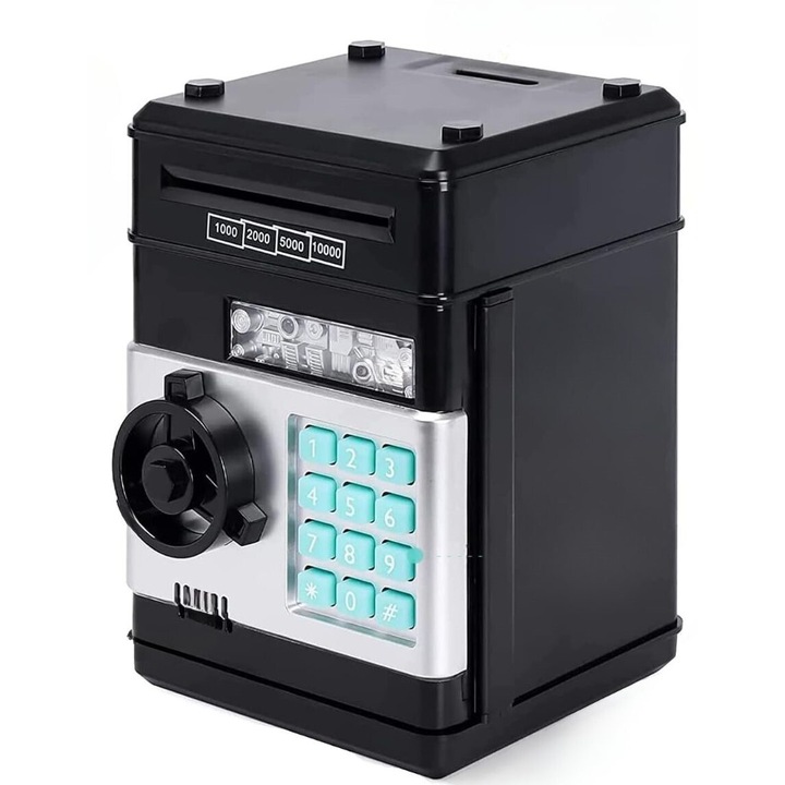 Pusculita Electronica cu Parola pentru Copii de 3 pana la 9 Ani, Bancomat Sigur pentru Economisirea Banilor, Cutie de Economii cu Functie pentru Bani si Monede, Cadou Educativ Perfect pentru Ziua de Nastere si Craciun, Negru