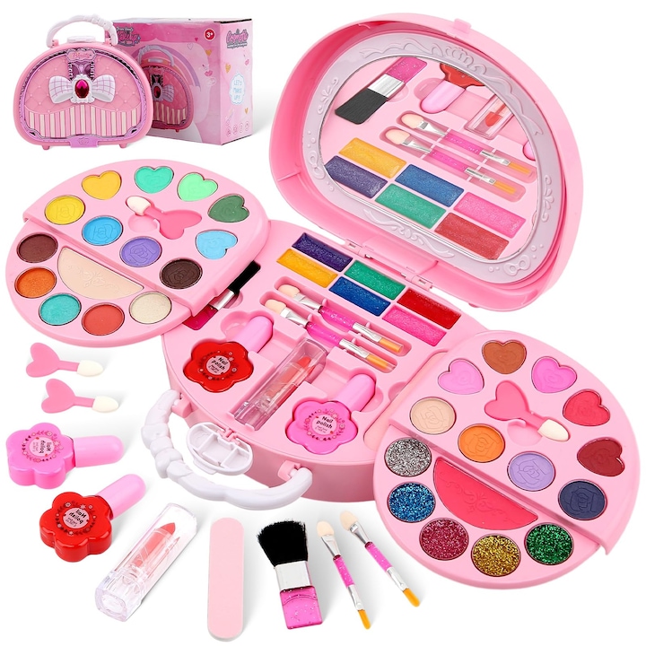 Trusa de machiaj pentru copii pentru fete, 36 buc, cu oglinda, cu geanta de mana, lavabil, cadou pentru fete cu varsta peste 3 ani, WALALLA, roz