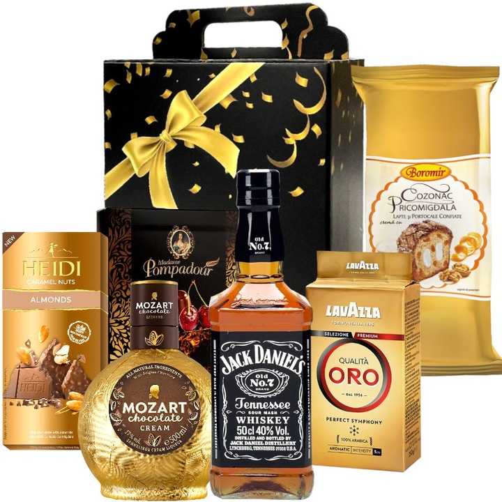 Pachet Cadou de Lux, CADOURI RAFINATE, model Special Time, cu Whiskey Jack Daniels, Lichior Mozart din Ciocolata Belgiana, Cafea Lavazza Oro, Ciocolata Heidi si Alte Specialitati Dulci, pentru Ocazii Festive, in Cutie Cadou Premium cu Maner, 7 Articole