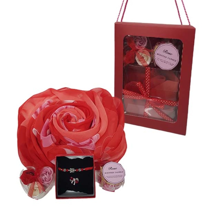 Set special, Womens's Day cu esarfa, martisor, lumanare parfumata si 3 trandafiri din sapun, rosu