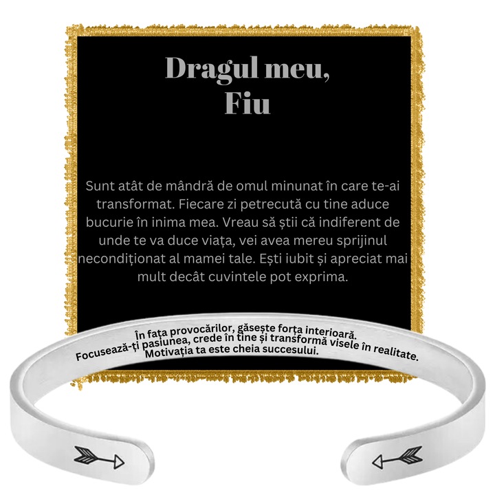 Set bratara cu mesaj motivational in interior, felicitare si cutie cu dragoste de la Mama pentru Fiu
