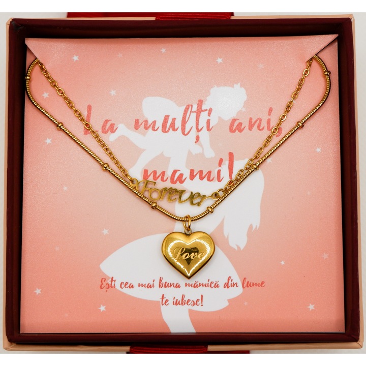 Set cadou pentru Mama - lantisor dublu cu pandantiv in forma de inima gravata "Love" si text volumetric "Forever", cutie de cadou si card cu mesaj pentru cea mai buna mama din lume