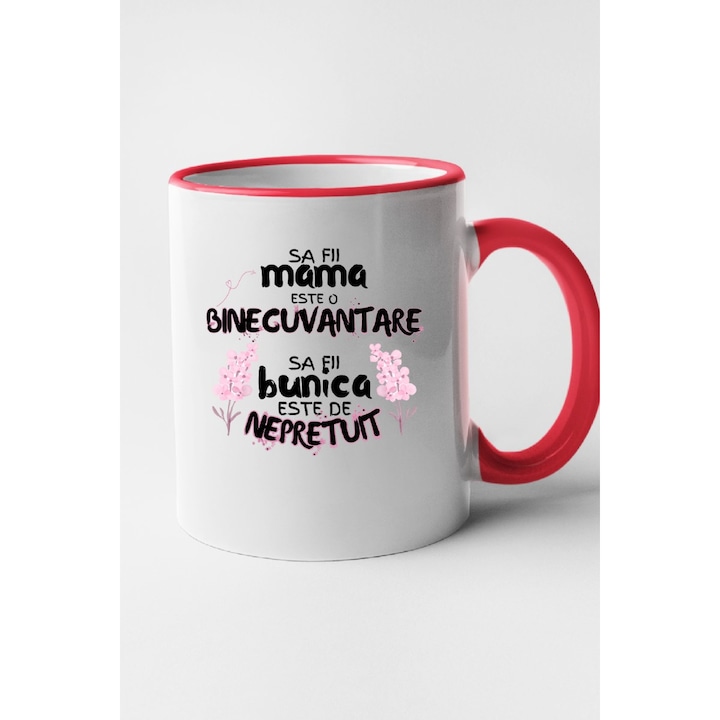 Cana personalizata cu imprimeu Sa fii mama este o binecuvantare, bunica este de nepretuit, Ceramica, 330 ml, Maner si interior Rosu