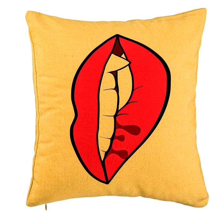 Perna Personalizata, Model Buze Femeie si Dinte de Vampir, 40x40 cm, Galben, Husa Detasabila, Burduf