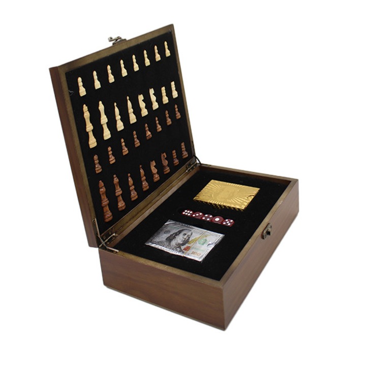 Set cadou pentru barbati VLV, cutie din lemn si piese pentru sah, zaruri si carti de joc, 26 x 7 cm