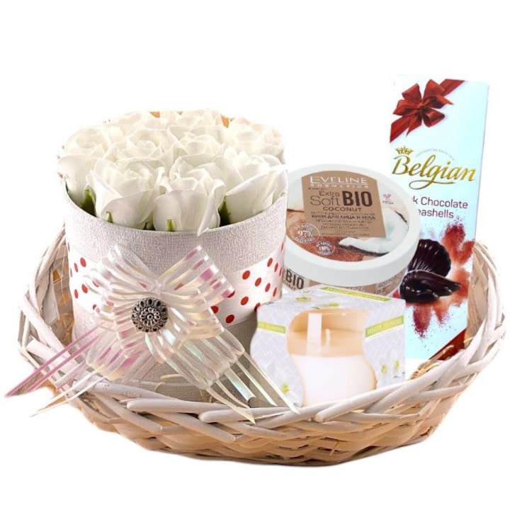 Cos Cadou pentru Femei, CADOURI RAFINATE, model White Elegance, cu Aranjament Floral, Praline Belgiene, Crema de Corp si Lumanare parfumata