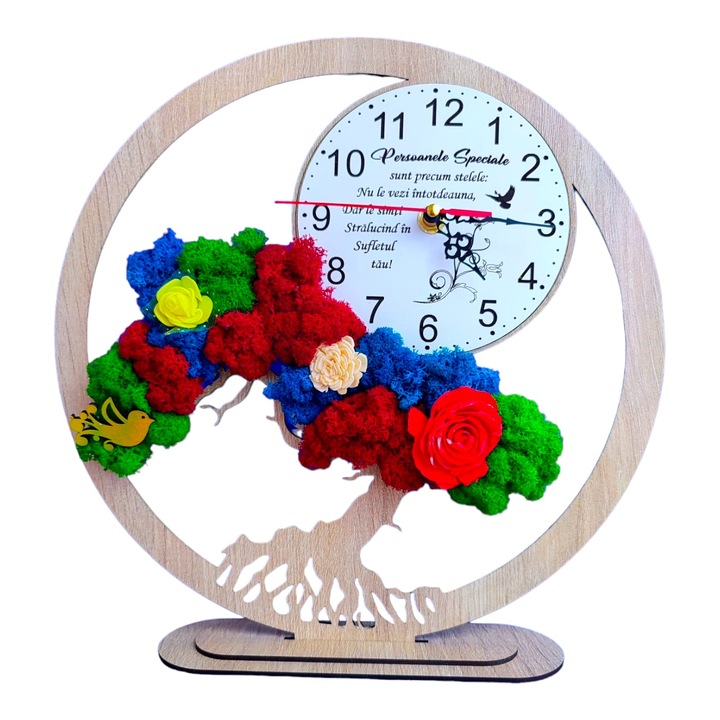 Ceas decorativ bonsai, personalizat cu mesaj standard pentru familie, prieteni, nasi, fini "Persoanele speciale...", decorat cu licheni stabilizati si flori decorative naturale, model 1, crem, 30cm