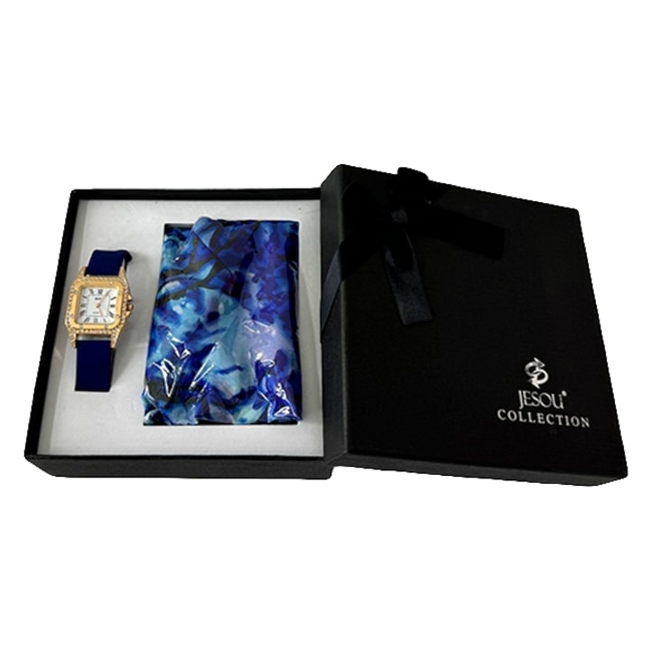 Set cadou pentru femei JESOU COLLECTION, cutie cu doua articole practice, ceas dama si esarfa, 17x17cm, Bluemarin
