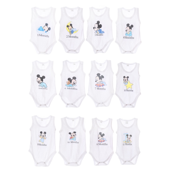 RECOSTORE - Set 12 body-uri aniversare pentru bebelusi, Mickey Mouse, REC2031, 1-12 luni