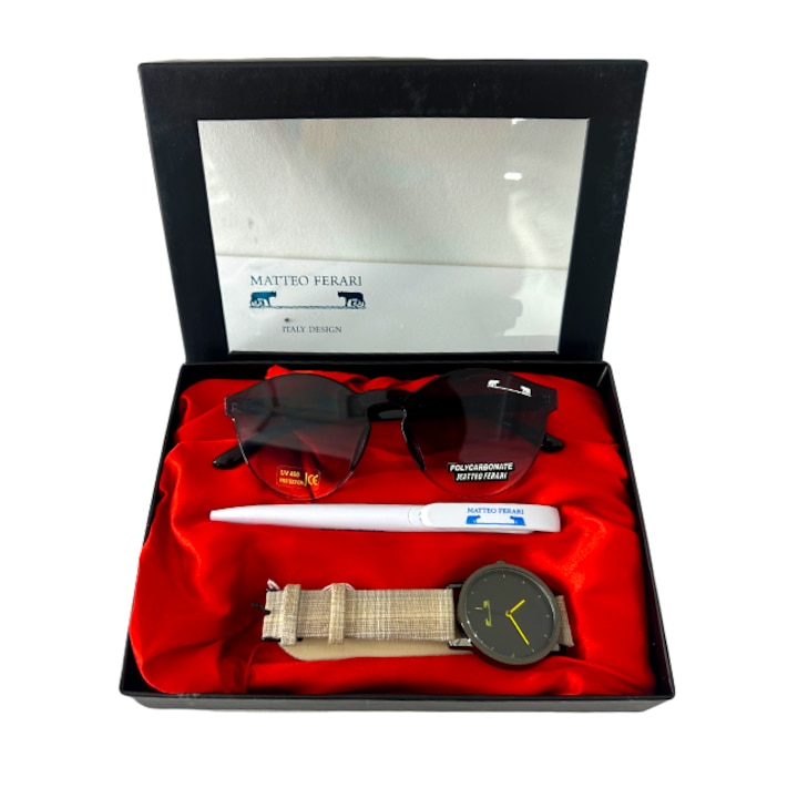 Set pentru femei MATTEO FERARI, cutie cu trei articole practice, ceas dama, ochelari de soare si pix 20.5x15cm, Crem, Velve