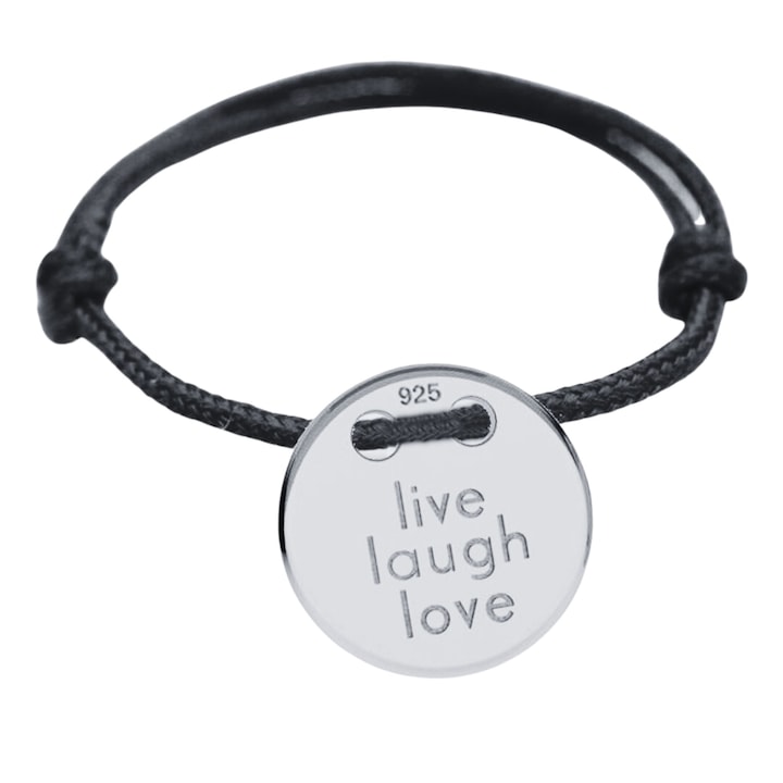 GlassIdeas - Inel Snur cu Pandantiv Charm Banut Gravat Rodiat Live Laugh Love Traieste Razi Iubeste, Reminder Bijuterii Argint cu Mesaje Inspirationale Celebrities Collection, Culoare Negru Argintiu