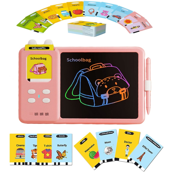 Set tableta LCD 2 in 1 pentru copii, cu cititor de carduri, MorFansi, 112 bucati carduri cu cuvinte, pentru scris, desenat si invatat, STEM, 3 ani+, Roz