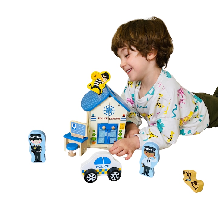 Jucarie educativa Montessori din lemn pentru copii peste 3 ani, Casa Portabila tip Statie de Politie si hot, Arelair Magic Box, cu eroi politisti