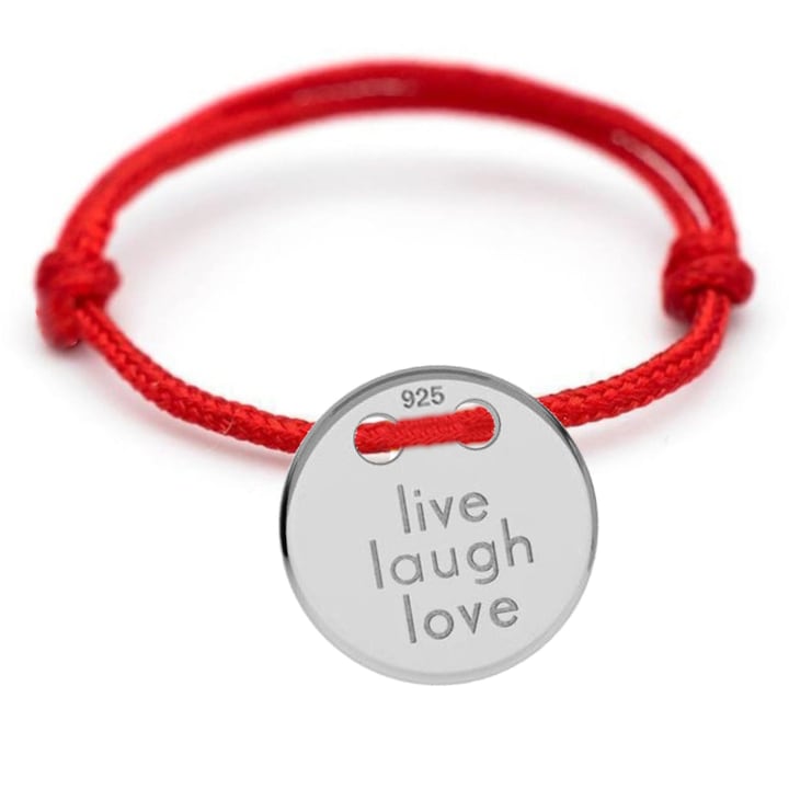 GlassIdeas - Inel Snur cu Pandantiv Charm Banut Gravat Rodiat Live Laugh Love Traieste Razi Iubeste, Reminder Bijuterii Argint cu Mesaje Inspirationale Celebrities Collection, Culoare Rosu Argintiu
