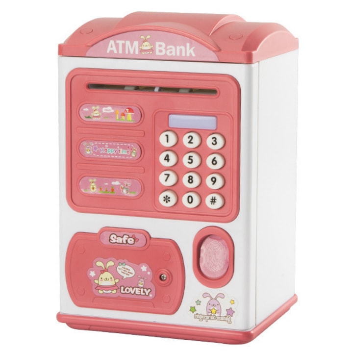 Pusculita bancomat digitala de jucarie roz pentru copii NicRONet cu parola si amprenta, capacitate mare de stocare pentru bancnote si monede, cadou perfect