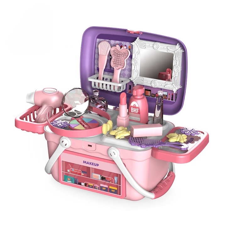 Trusa de machiaj pentru copii, Set Make-Up BUGHY'S, Design inedit, Geanta cu maner pentru transport, pentru Fetite de 3, 4, 5, 6, 7, 8, 9 ani, Kit de machiaj si de coafura pentru copii, Ruj, Oglinda, Uscator de Par, Multicolor