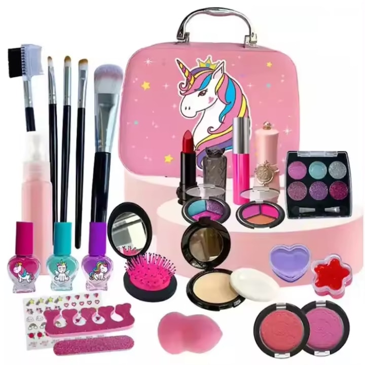 Trusa de machiaj pentru copii, Set Make-Up Simply Joy, cu 31 de elemente pentru make-up, rujuri, farduri, oja, Unicorn, geanta cu maner pentru transport, pentru fetite de 3,4,5,6,7,8,9 ani