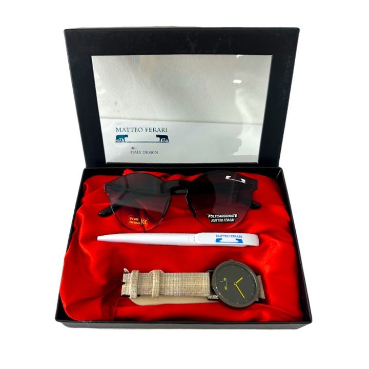 Set pentru femei MATTEO FERARI, cutie cu trei articole practice, ceas dama, ochelari de soare si pix 20.5x15cm, Crem, Velve