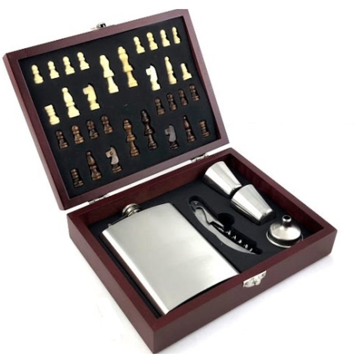 Set cutie eleganta cadou, joc de sah complet, plosca de 250 ml din inox cu 2 pahare pentru tarie, briceag cu desfacator si palnie