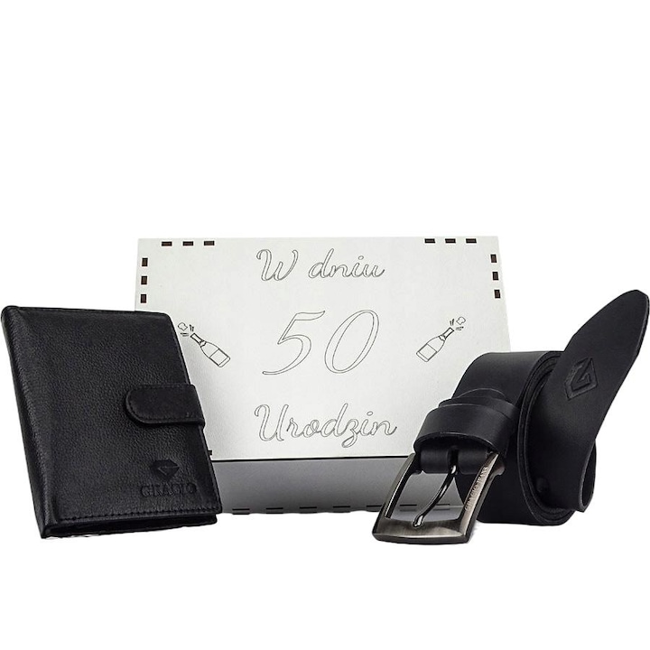 Set cadou curea/portofel barbati, Gracio, Aniversare 50 ani, Piele naturala,12.5 x 10 x 2.5 cm, 100 cm, Negru