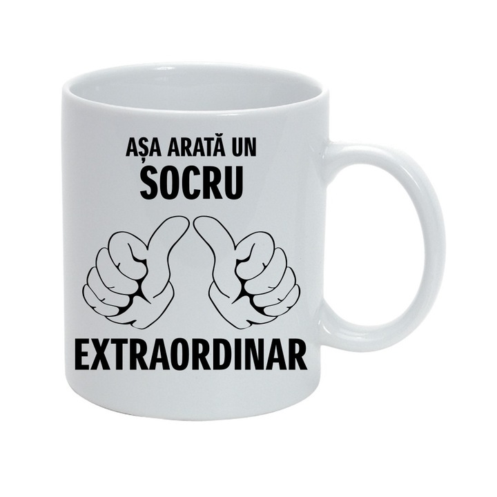 Cana personalizata cu mesaj "Asa arata un socru extraordinar", Vlatud, ceramica, alb, 330ml