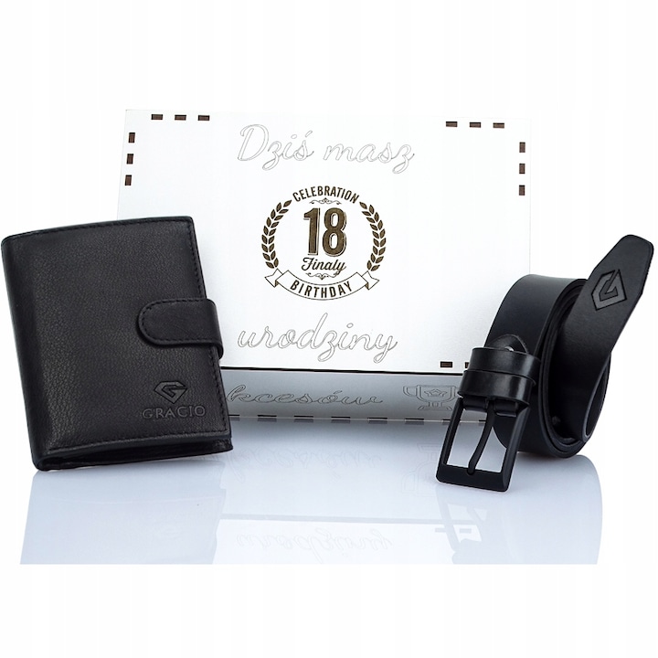 Set curea/portofel pentru barbati, Aniversare 18 ani, GRACIO, Piele naturala, Negru, 135cm