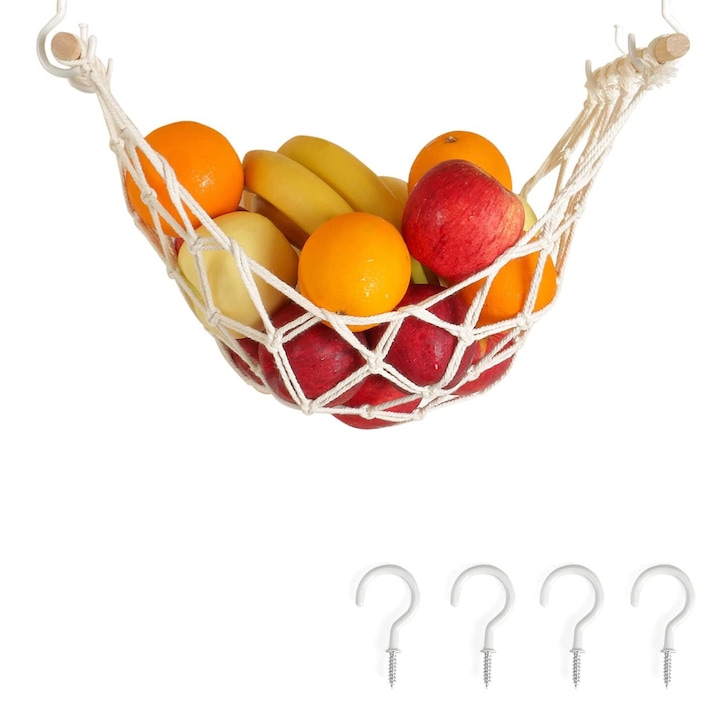 Hamac pentru fructe Jormftte, handmade, 100% bumbac, capacitate 15-20 fructe, cu carlige, decor boho