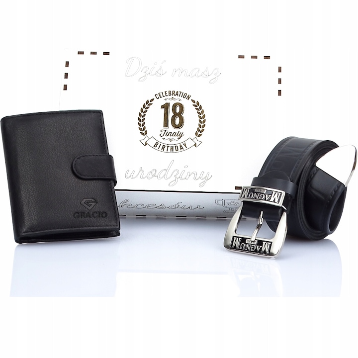 Set curea si portofel pentru barbati pentru aniversarea de 18 ani, Gracio, Piele, Negru, 145cm