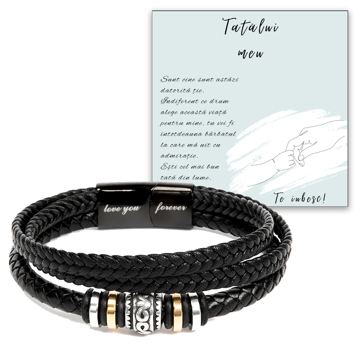 Set CAdou Pentru Tata, Bratara Cu 3 Randuri Din Piele Eco, JOYSTOS, Gravata Cu Text "Love You Forever", Si Card Foto Cu Mesaj Pentru Tata "Tatalui meu. Sunt Cine Sunt Datorita Tie."