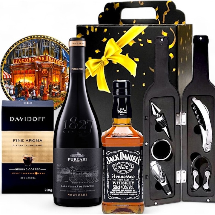 Pachet Cadou Barbati, CADOURI RAFINATE, model Exclusive Men's Gift, cu Vin Purcari Nocturne, Whiskey Jack Daniel'S, Set de Accesorii pentru Vin in Cutie in Forma de Sticla, Cafea Davidoff, Fursecuri Daneze in Cutie Metalica, 6 articole