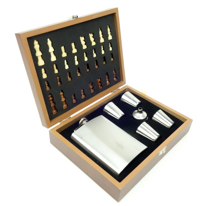 Set cadou King, cutie din lemn cu piese pentru sah, 4 accesorii de Vin si sticla de vin Bottega sauvignon Delle Venezie, 36 x 21 cm, Velve, Maro
