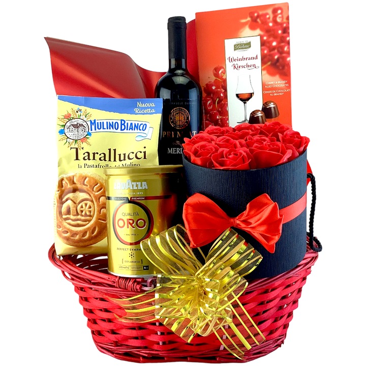 Cos cadou pentru femei cu aranjament floral, Lavazza ORO, Mulino Bianco si alte delicii