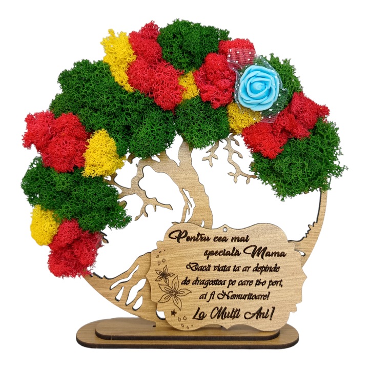 Decoratiune tablou copacul vietii, decorat cu licheni stabilizati si flori decorative, personalizat cu mesaj standard pentru mama, dimensiune 15cm, model 2, maro